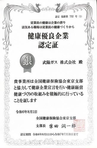 弊社は全国健康保険協会東京支部の「健康企業宣言事業」に参加し、健康づくりに対する取組みを行ってまいりました。このたび、2024年8月1日に全国健康保険協会東京支部の「健康優良企業」に認定されました。