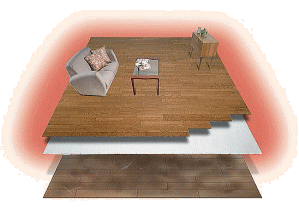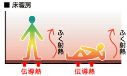 電気エアコンなどで足元付近の体感温度を約20℃にするには、設定温度を約27℃にしなければなりません。ところが、足元から伝導熱とふく射熱で暖める床暖房なら、約20℃の設定で十分。低い温度設定で部屋全体をマイルドに暖めることができ、足元はもちろん体全体がポカポカ。冷え性をやわらげる効果もあります。ふく射熱による暖房は、対流式のエアコンやヒーターに比べ、室温を約4℃低く設定しても、同程度の暖かさが得られます。