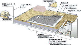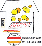 温水床暖房は伝導熱・ふく射熱を利用した最も快適な暖房システムです。熱源機で暖めた約60℃の温水を床下に循環。そのマイルドなあたたかさが、床材を通して部屋全体に伝わるしくみになっています。
