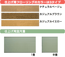 温水床暖房の床仕上げ材は、リビング、子供部屋、和室などお部屋の用途や雰囲気に合わせてコーディネートできるバリエーションをご用意しております。やさしい木目調のスタンダード「ナチュラルベージュ」、シックで落ち着いたお部屋を演出する「カジュアルブラウン」、明るいお部屋に最適な「カジュアルイエロー」、今お使いの畳から入れ替え簡単。日焼けに強く変色を抑え、さらに耐水性も高い「床暖房用定尺畳」、以上からお選びいただけます。