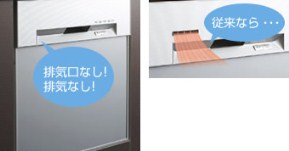 排気を出さない「水冷式除湿排気回収システム」の採用により、廃棄レスタイプが実現。排気口がないので前面がスッキリし、フラット感がアップしました。ニオイやキャビネットの結露の心配もなく、快適なキッチン空間をキープできます。