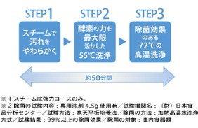 高温のスチームがこびりついた汚れをやわらかくし、さらに、酸素の力を最大限に活用した55℃洗浄と除菌効果もある72℃の高温強力噴射水で、洗い流します。