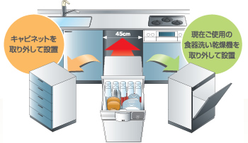 今、お使いのキッチンに専用キャビネットを使用してスッキリ設置。現在ご使用中の食器洗い乾燥機との取り替えにも対応できます。