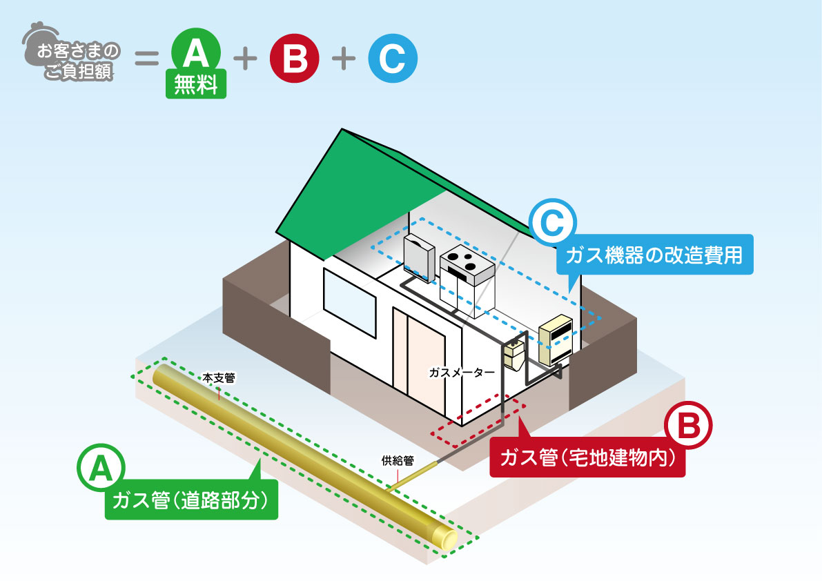 道路の掘削工事及び供給管工事の費用はいただいておりません。前面道路にガス管がないお客様のみ費用をいただいております。前面道路のガス管埋設状況については弊社までお問い合わせください。