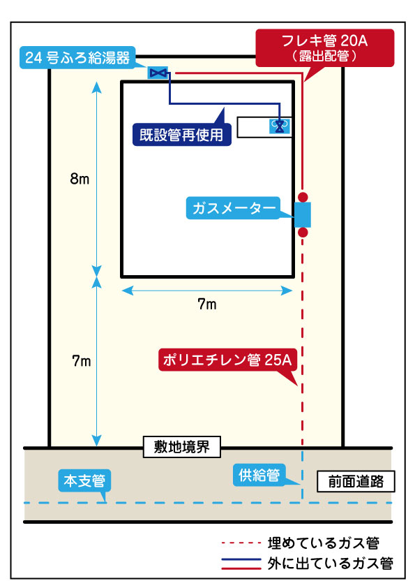 切替え特別単価として平均8万円で施工しています。敷地の大きさや配管方法、ガス栓の数によって変わります。図は施工例となりますので一例としてご覧ください。正確なお見積りは一度現場調査(無料)が必要になりますので、弊社までお問い合わせください。