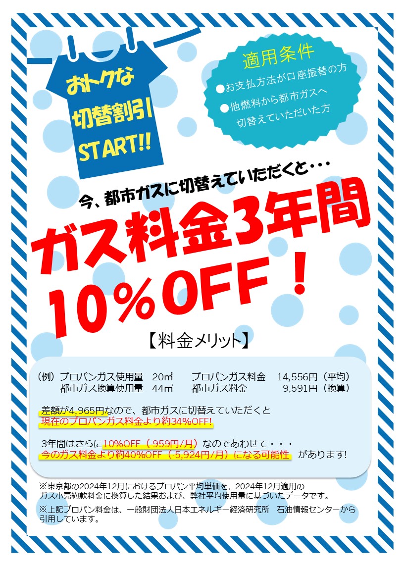 都市ガスに切り替えしていただいたお客様限定でガス料金3年間10%OFFキャンペーンを実施中です!